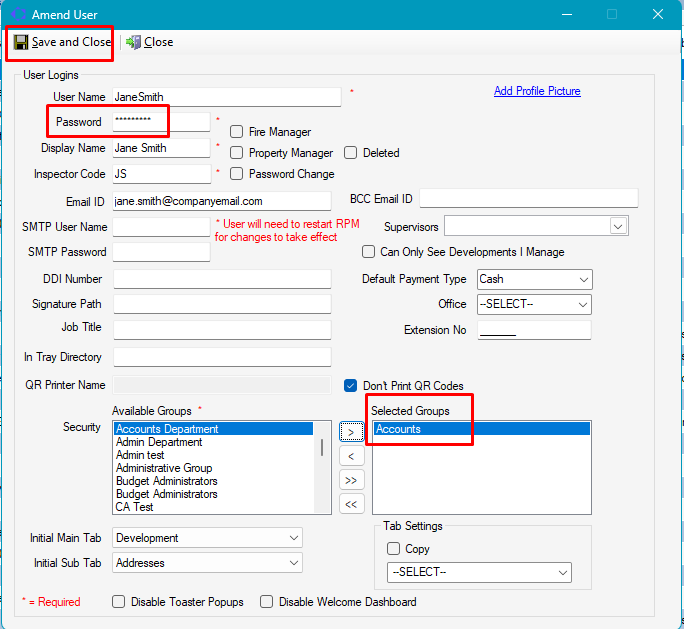 - Add a password and add permissions by moving relevant Available Groups to the Selected Groups box.